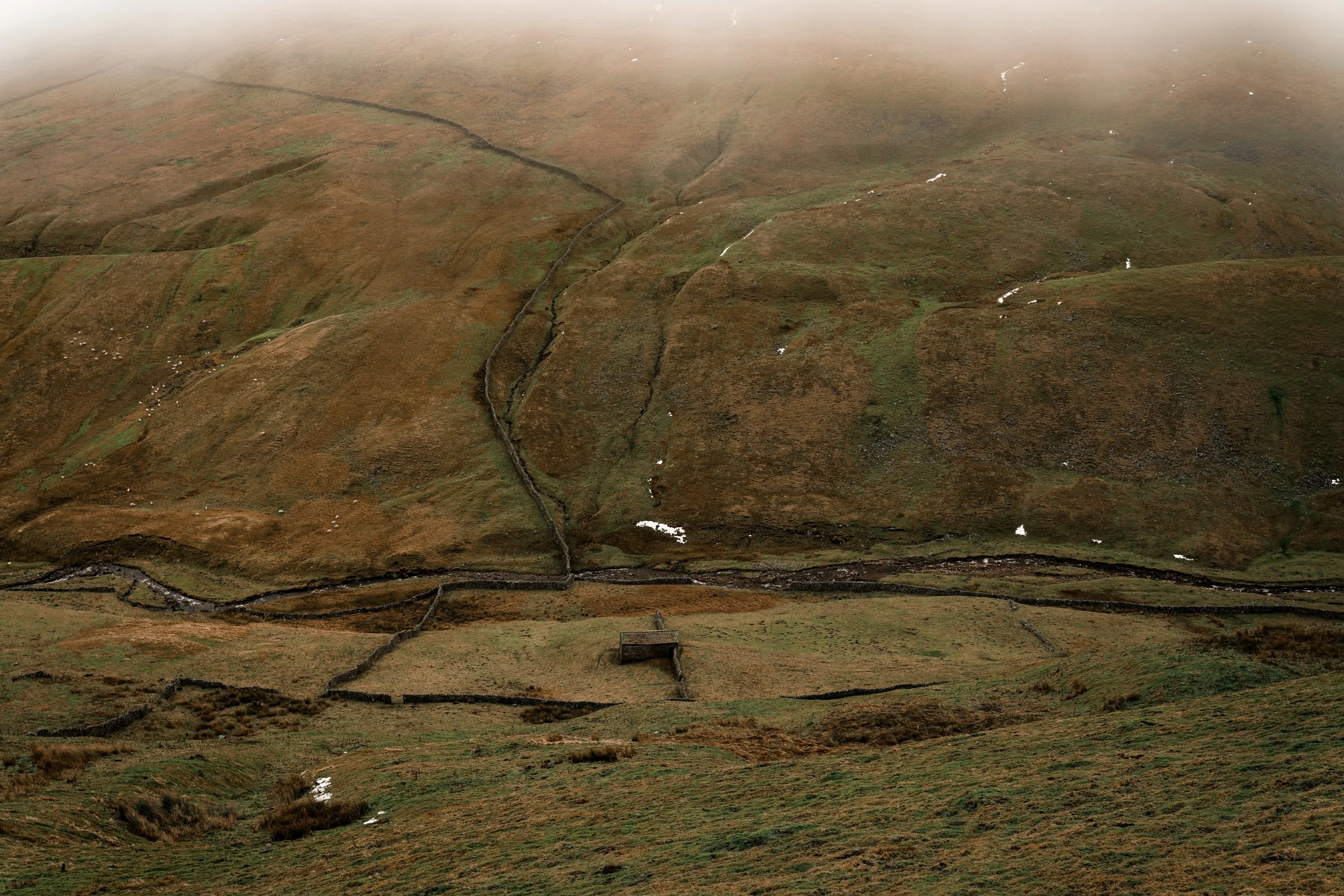 The Yorkshire Dales were to bring us a true delight the following day, and a newfound appreciation for the beauty of the UK. We rose before dawn to pack up our gear and avoid unwanted attention, braved a splash wash in the icy river and set off. Our first stop was the famous Ribblehead Viaduct, a sight Ben had particularly wanted to see but sadly had no such luck; a thick fog had settled on the moors overnight. Instead we headed for Buttertubs Pass, passing through quaint farming villages of stone houses that looked reminiscent of a scene out of Emmerdale. We stopped to brew a coffee at the top of the pass in bone-chillingly cold wind, but it was only when we began to descend that the sun burst through the fog and laid before us the most spectacular scene.